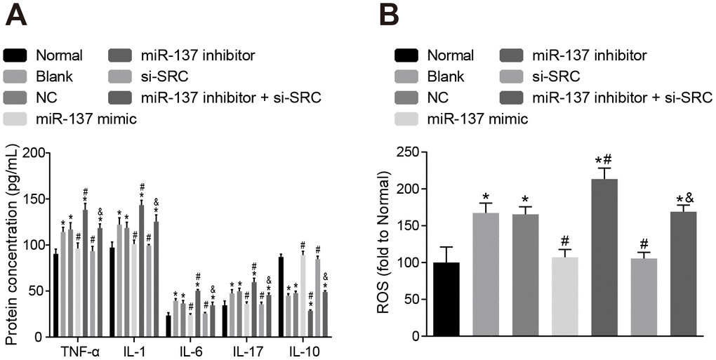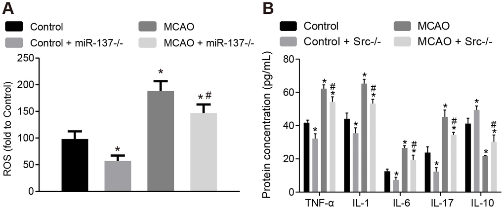 Subsequently, we measured the expression of inflammatory factors and ROS and found that the expression of TNF-α, IL-1, IL-6, IL-17 and ROS was elevated (Figure 13A, 13B), while the expression of IL-10 was reduced in astrocytes exposed to OGD (p < 0.05). On the other hand, astrocytes treated with miR-137 mimic or si-Src showed opposite trends when compared with normal astrocytes (p < 0.05). These findings revealed that OGD treatment increased oxidative stress in cells and inflammation, while up-regulation of miR-137 or inhibition of Src reversed these effects in astrocytes.