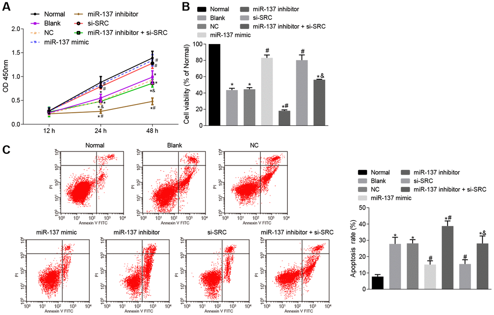 miR-137 mimic, miR-137 inhibitor and negative controls were purchased from Shanghai Reborn Biological Engineering Co., Ltd. (Shanghai, China). Lentivirus containing Src siRNA was purchased from Shanghai Genechem Co., Ltd. (Shanghai, China). Cells were incubated in a 5% CO2 incubator at 37°C, and then transfected with one of the above miRNAs, respectively after cells reached 80% confluence. LipofectamineTM 2000 and miR-137 mimic or miR-137 inhibitor were prepared according to the Lipofectamine 2000 instructions (Invitrogen, Carlsbad, USA). After transfection for 48 h, the cells were collected and used in subsequent experiments. After even trituration, the 6-well plate was placed in a 5% CO2 incubator at 37°C for 48 h.