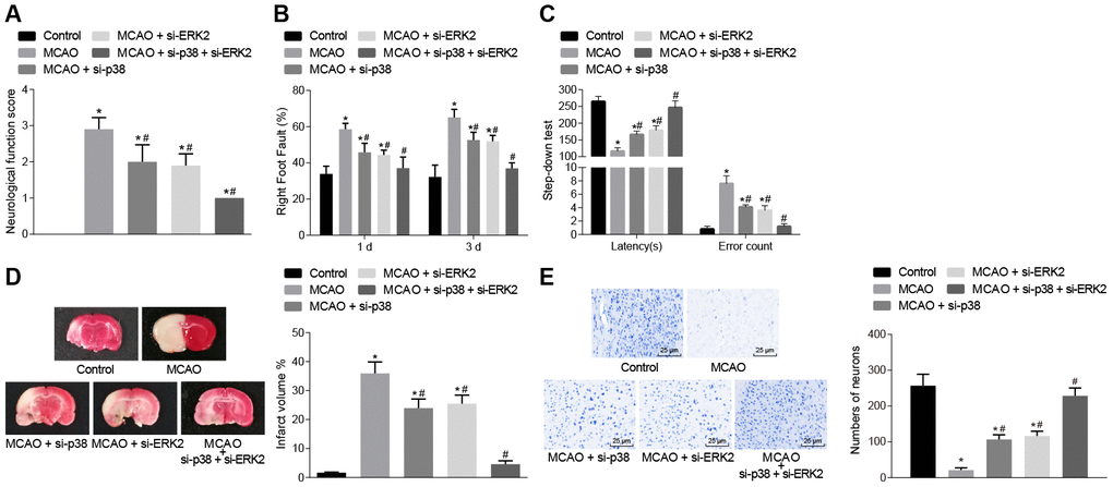 The mice then underwent a series of behavioral tests including, nerve function scores, the foot-fault test and the step-down test (Figure 2A–2C). Wild-type mouse models of MCAO treated with lentivirus exhibited increased neurological function scores, number of errors, and rate of left limb fault step, and shorter latency period compared with sham-operated mice (control mice), (p < 0.05). This observation was eliminated in the mice treated with p38 small interfering RNA (siRNA) or Erk2 siRNA.