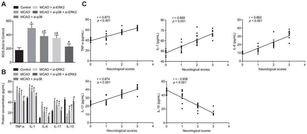 Next, we measured the levels of reactive oxygen species (ROS) and inflammatory factors in mouse brain tissues. The levels of ROS, tumor necrosis factor-α (TNF-α), interleukin (IL)-1, IL-6 and IL-17 were increased in comparison to control mice (Figure 3A, 3B), while IL-10 concentration was decreased in brain tissues of wild-type mouse models of MCAO treated with lentivirus (p < 0.05). Treatment with si-p38 or si-Erk2 reversed the effects of lentiviral treatment (p < 0.05). Correlation analysis (Figure 3C) showed that neurological function score was positively correlated with the expression of TNF-α, IL-1, IL-6 and IL-17 (r > 0, p < 0.05), and negatively correlated with IL-10 expression (r < 0, p < 0.05). Inhibition of the p38 or ERK2 signaling pathway reduced oxidative stress and inflammation in MCAO mice, thereby improving neuronal injury and learning and memory abilities in mice.