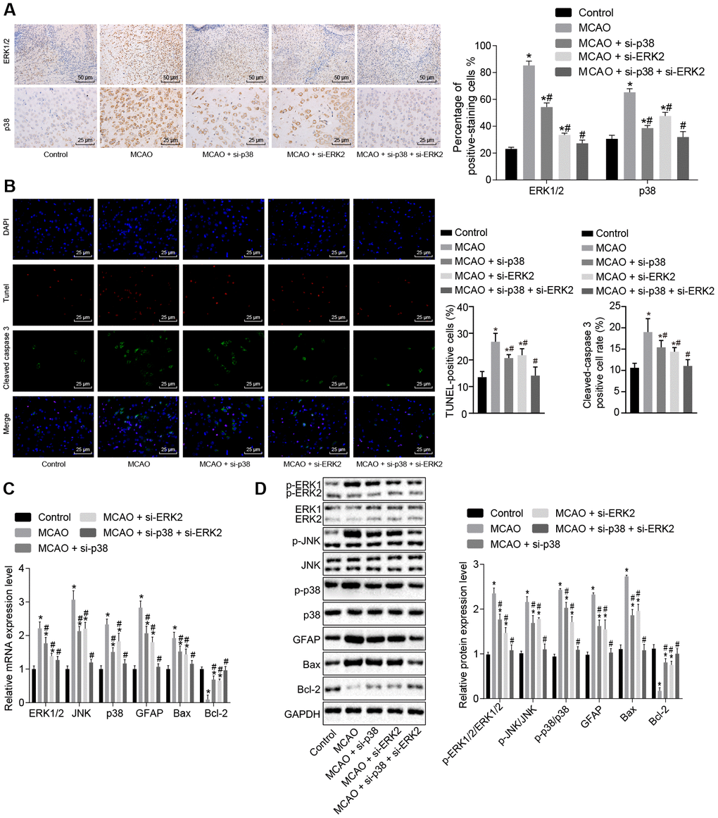 Next, we sought to examine the effect of the p38 or ERK2 signaling pathway on cell apoptosis. Immunohistochemistry showed that (Figure 4A) ERK1/2 was mainly located in the cell nucleus, and p38 was mainly located in the cytoplasm. Compared with control mice, wild-type mouse models of MCAO treated with lentivirus exhibited a significantly higher number of ERK1/2 and p38 positive cells (p < 0.05); however, wild-type mice treated with p38 siRNA or Erk2 siRNA exhibited opposite results (p < 0.05).