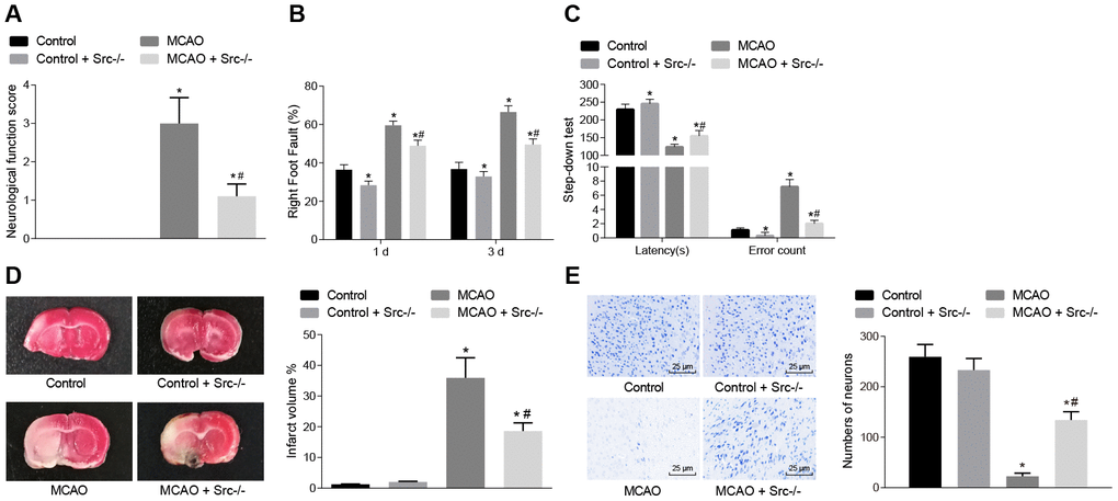 In the following experiments, nerve function scoring, foot-fault test results, the step-down test, TTC staining and Nissl staining were used to investigate the role of Src in regulating cerebral infarction, neuron function and learning and memory in MCAO mice. Nerve function scoring, foot-fault test and step-down test (Figure 5A–5C) showed that wild-type mouse models of MCAO exhibited higher neurological function scores, number of errors, and rate of left limb fault step, and shorter latency period (p < 0.05), while it was reversed in Src-/- mice (p < 0.05).