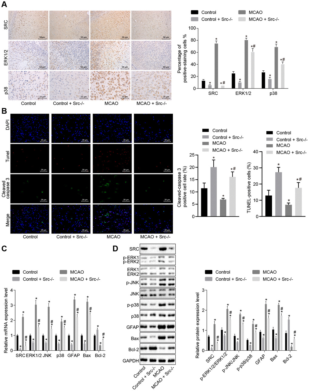 Next, immunohistochemistry was performed and the results showed that Src protein was mainly located in the cell nucleus (Figure 7A). More cells stained positive for ERK1/2, p38 and Src in wild-type mouse models of MCAO compared with sham-operated wild-type mice (p < 0.05); however, staining was decreased in Src-/- mice (p < 0.05). Immunofluorescence analysis (Figure 7B) revealed that the number of cleaved caspase 3+ and TUNEL+ cells was elevated in wild-type mouse models of MCAO but reduced in Src-/- mice in comparison to sham-operated wild-type mice (p < 0.05).