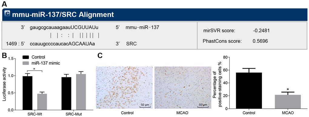 In the subsequent experiments, we studied the relationship between miR-137 and Src gene. Bioinformatic analysis using the website microRNA.org, predicted that miR-137 could target the Src gene (Figure 8A). Dual-luciferase reporter assay (Figure 8B) confirmed this interaction as the luciferase activity of Src wild-type 3’UTR was significantly inhibited by miR-137 mimic (p < 0.05) compared with sham-operated wild-type mice. The luciferase activity of mutant 3’UTR was not impacted by the addition of miR-137 mimic (p > 0.05). In situ hybridization (Figure 8C) showed that positive staining for miR-137 probe was purple and granular and was widely distributed in the cerebral cortex and hippocampus. Wild-type mouse models of MCAO exhibited lower miR-137 expression in brain tissues than sham-operated wild-type mice. These findings showed that Src was downregulated by miR-13, and that miR-137 was poorly expressed in the brain tissue of MCAO mice.
