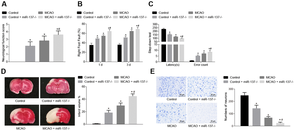 We then examined the effects of MCAO treatment and miR-137 on behavioral function. Nerve function scoring, foot-fault test, step-down test, TTC staining and Nissl staining were used to determine the effect of miR-137 on cerebral infarction, neuron functions and learning and memory abilities in MCAO mice. MCAO- and miR-137 knockout (miR-137-/-)-treated mice exhibited increased neurological function scores, number of errors, and rate of left limb fault step, yet shorter latency period compared with sham-operated wild-type mice (Figure 9A–9C) (p < 0.05).
