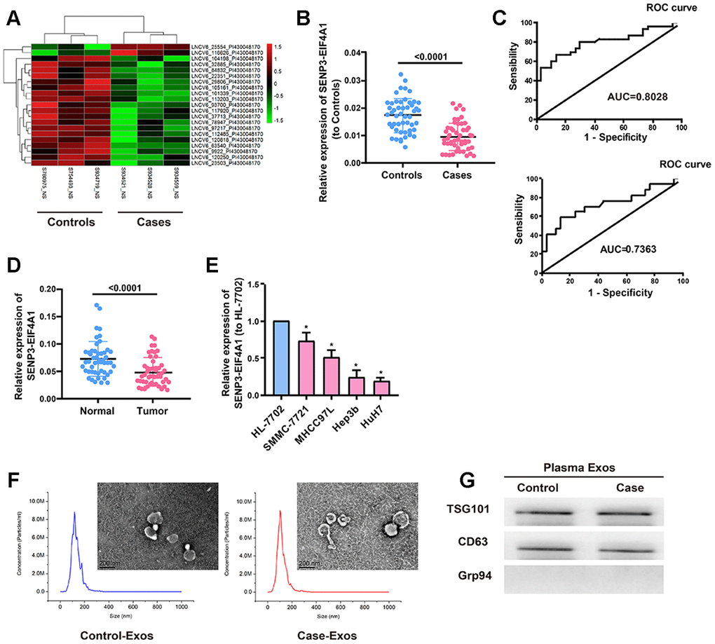 Figure 1. Expression of plasma exosomal SENP3-EIF4A1 in patients with HCC. Exosomes (exos) are isolated from the plasma of HCC patients and healthy controls. (A) Heatmap illustrating the 21 differentially expressed lncRNAs between HCC patients’ plasma exos and healthy control patients’ plasma exos. (B) Detection of SENP3-EIF4A1 in exos from plasma via qRT-PCR. (C) Receiver Operating Characteristic (ROC) curve for the SENP3-EIF4A1 to distinguish HCC cases from controls (Top). Receiver Operating Characteristic (ROC) curve for the SENP3-EIF4A1 to distinguish TNM I/II stage HCC cases from controls (bottom). (D) Determination of SENP3-EIF4A1 in tumor tissues and adjacent normal tissues via qRT-PCR. (E) SENP3-EIF4A1 is lowly expressed in HCC cells compared with HL-7702 cell line. (F) Micrographs and the size distribution of exos isolated from the plasma of HCC patients (left) and healthy controls (right) were detected using TEM (bars =200 nm) and NTA. (G) Detection of TSG101, CD63 and Grp94 in circulating exos via Western blotting. Results are shown as mean ± SD. *P<0.05. All of the experiments were performed in triplicate.