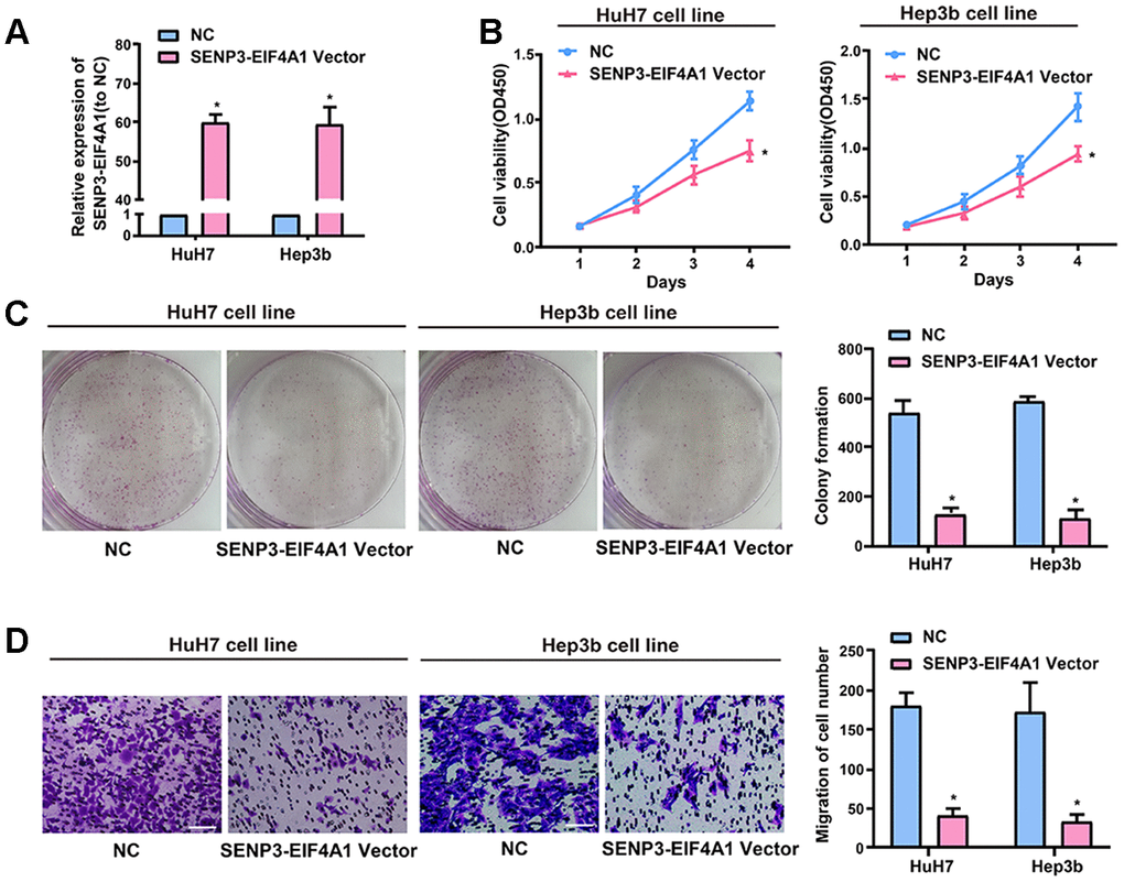 Figure 2. Effect of SENP3-EIF4A1 on HCC cellular phenotype. HuH7 and Hep3b cells are transfected with SENP3-EIF4A1 plasmids or NC vectors. (A) Detection of the mRNA level of SENP3-EIF4A1 via qRT-PCR. (B) Examination of cell viability via CCK8 assays. (C) Determination of cell colony formation ability via a colony-forming growth assay. The colonies are counted and captured. (D) Representative images of migration assays of HuH7 and Hep3b cells (bars =100 μm). The cells are counted. Results are shown as mean ± SD. *P<0.05. All of the experiments were performed in triplicate.