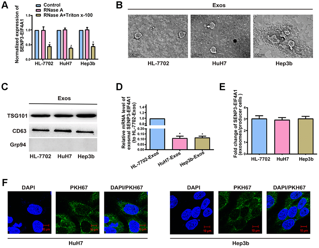 Figure 3. Exosomal SENP3-EIF4A1 mediates intercellular communication. Exos are separated from the medium of HL-7702, Hep3b and HuH7 cells. (A) Detection of the normalized expression of SENP3-EIF4A1 in the medium of HL-7702, Hep3b and HuH7 cells receiving treatment with RNase (2μg/ml) alone or combined treatment with RNase (2μg/ml) and Triton X-100 (0.1%) for 20min via qRT-PCR. (B) Micrographs of exos separated from HL-7702 (left), HuH7 (middle) and Hep3b cells (right, bars=200 nm). (C) Examination of TSG101, CD63 and Grp94 in exos of cell lines via Western blotting. (D) Detection of exosomal SENP3-EIF4A1 of HL-7702, Hep3b and HuH7 via qRT-PCR. (E) Assessment of the fold change of SENP3-EIF4A1 between exos of HL-7702, Hep3b and HuH7 and their producer cells via qRT-PCR. (F) Exos from HL-7702 cells are labeled with PKH67; green represents PKH67, and blue represents nuclear DNAs stained by DAPI. Hep3b and HuH7 cells undergo 3 h of incubation with exos from HL-7702 cells. Results are shown as mean ± SD. *P<0.05. All of the experiments were performed in triplicate.