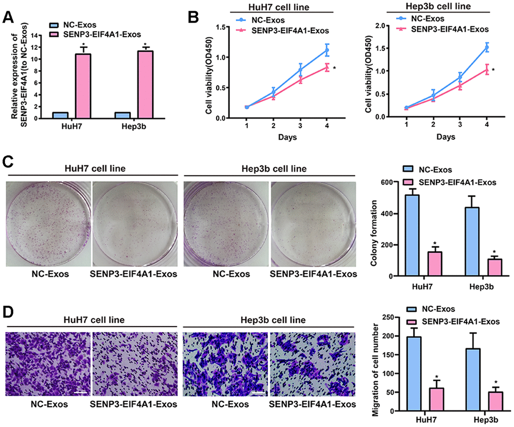Figure 4. Effect of exosomal SENP3-EIF4A1 on HCC cellular phenotype. Exosomes separated from HL-7702 cells transfected with SENP3-EIF4A1 overexpression plasmids or NC vectors are named SENP3-EIF4A1-Exos or NC-Exos, respectively. After extraction, their exosomes are added to the HuH7 and Hep3b cells for 24h. (A) Detection of the mRNA level of SENP3-EIF4A1 via qRT-PCR. (B) Detection of cell viability by a CCK8 assay. (C) Examination of cell colony formation ability by a colony-forming growth assay. The colonies are counted and captured. (D) Representative images of migration assays of HuH7 and Hep3b cells (bars =100 μm). The cells are counted. Results are shown as mean ± SD. *P<0.05. All of the experiments were performed in triplicate.