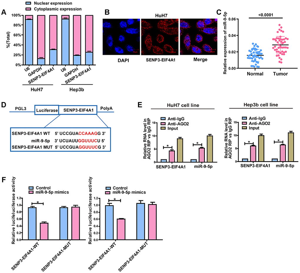 Figure 5. SENP3-EIF4A1 interacts with miR-9-5p in a direct manner. (A) Cytoplasmic and nuclear levels of SENP3-EIF4A1 in HuH7 and Hep3b cells analyzed by qRT-PCR. (B) The RNA-FISH results verified that SENP3-EIF4A1 was distributed mostly in the cytoplasm in HuH7 cells. (C) MiR-9-5p expression in HCC tissues and adjacent normal tissues detected by qRT-PCR. (D) Bioinformatics evidence of binding of miR-9-5p onto 3'-UTR of SENP3-EIF4A1. (E) RIP experiments for the amount of SENP3-EIF4A1 and miR-9-5p in HuH7 and Hep3b cells. (F) Dual-luciferase reporter gene assay in HuH7 and Hep3b cells after transfection with negative control or miR-9-5p mimics, Renilla luciferase vector pRL-SV40 and the reporter constructs. Data are presented as mean ± SD. *P<0.05. All of the experiments were performed in triplicate.