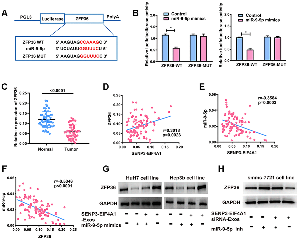 Figure 6. ZFP36 is the direct target of miR-9-5p. (A) The putative miRNA binding sites in the ZFP36 sequence. (B) Direct target sites verified by the dual-luciferase reporter gene assay. (C) ZFP36 expression in HCC tissues and adjacent normal tissues detected via qRT-PCR. (D) Bivariate correlation analysis of the relationship between SENP3-EIF4A1 and ZFP36 expression level. (E) There was a significantly negative correlation between the expression level of SENP3-EIF4A1 and the expression level of miR-9-5p in the same paired HCC samples. (F) There was a significantly negative correlation between the expression level of ZFP36 and the expression level of miR-9-5p in the same paired HCC samples. (G) ZFP36 in HuH7 and Hep3b cells with SENP3-EIF4A1-Exos and/or miR-9-5p mimics examined via Western blotting. (H) ZFP36 in SMMC-7721 cells with SENP3-EIF4A1 siRNA-Exos and/or miR-9-5p inhibitor examined via Western blotting. Data are shown as mean ± SD. *P<0.05. All of the experiments were performed in triplicate.