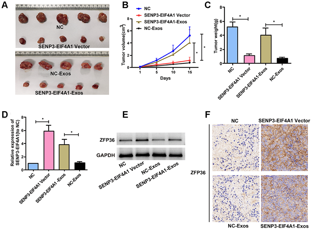 Figure 7. Effects of SENP3-EIF4A1 overexpression and exosomal SENP3-EIF4A1 on tumor in vivo. HuH7 cells are transfected with SENP3-EIF4A1/NC lentiviral vectors, namely SENP3-EIF4A1 vectors and NC, respectively. Exos are separated from HL-7702 cells transfected with SENP3-EIF4A1/NC lentiviral vectors, namely SENP3-EIF4A1-Exos and NC-Exos, respectively. (A) The xenografts from nude mice inoculated in NC, SENP3-EIF4A1-Exos, SENP3-EIF4A1 vectors and NC-Exos (n=5, each group). (B) The tumor volumes are measured every other day after injection. (C) Determination of the tumor weights in nude mice after 15 days. (D) Detection of SENP3-EIF4A1 expression in tumor tissues of nude mice treated with NC, SENP3-EIF4A1 vectors, SENP3-EIF4A1-Exos and NC-Exos by qRT-PCR. (E) Detection of ZFP36 in tumor tissues via Western blotting. (F) Analysis of ZFP36 expression in tumor tissues by IHC. Results are shown as mean ± SD. *P<0.05.