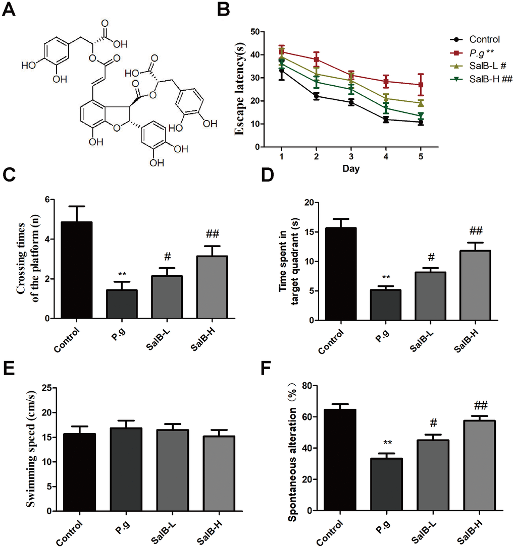 These mice were infected with P. gingivalis according to previous method [22]. Briefly, mice were infected with P. gingivalis (1×108 CFU/mouse) every 3 days by intraperitoneally injection for 3 weeks. The mice were randomly assigned to four treatment groups (n = 15 per group): vehicle control group (0.9 % saline), P. gingivalis-infected group (P.g), low-dose SalB group (P. gingivalis-infected mice, SalB 20 mg/kg/d), high-dose SalB group (P. gingivalis-infected mice, SalB 40 mg/kg/d). Mice were treated with saline and SalB, respectively, by gavage, once per day for four weeks.
