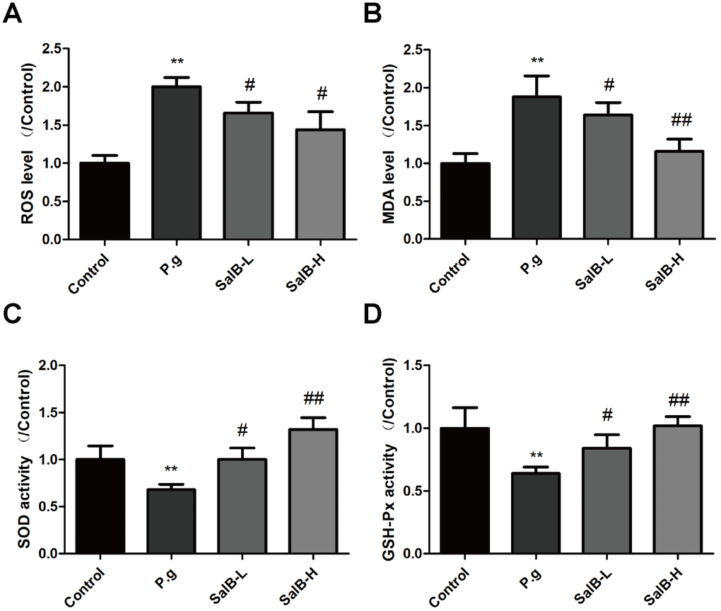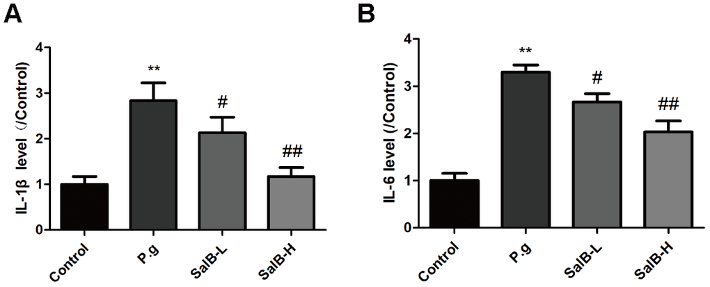 We further investigated the protection against oxidative stress and anti-neuroinflammation effects of SalB. As shown in Figure 2, increased levels of oxidative stress indicators, ROS and MDA, as well as suppressed activities of antioxidant enzymes, SOD and GSH-Px, were observed in the hippocampus of P. gingivalis-infected mice. SalB significantly decreased the levels of ROS and MDA. Moreover, SalB significantly increased the activities of SOD and GSH-Px. In addition, inflammatory factors (IL-1β and IL-6) were also elevated in the hippocampus of P. gingivalis-infected mice, compared with control group (Figure 3). SalB significantly decreased the levels of IL-1β and IL-6. These results indicated that the neuroprotective effects of SalB could be related to its protection against oxidative stress and anti-neuroinflammation effects.