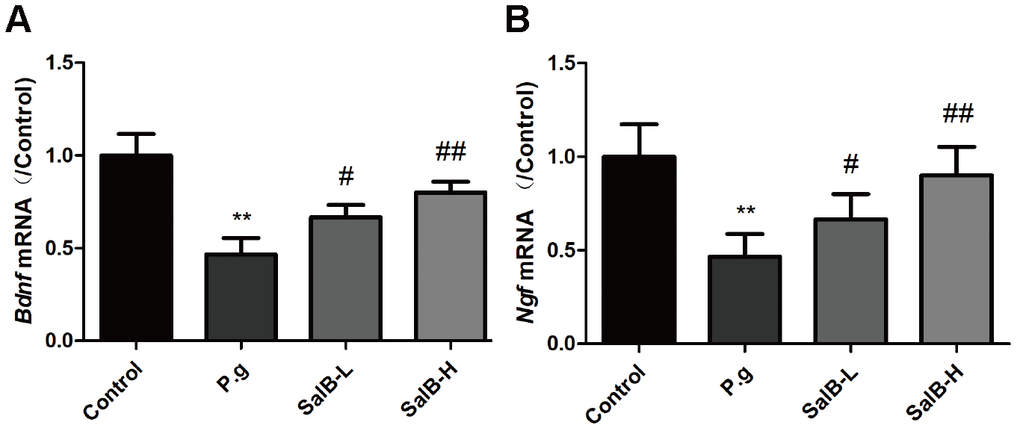 We also tested the neurotrophic factors (BDNF and NGF) to evaluate the nervous system function of P. gingivalis-infected mice. As shown in Figure 4, the mRNA levels of bdnf and ngf were decreased in the hippocampus of P. gingivalis-infected mice. After treatment with SalB, the mRNA levels of bdnf and ngf were increased. These data suggested that SalB could increase the gene expressions of bdnf and ngf.