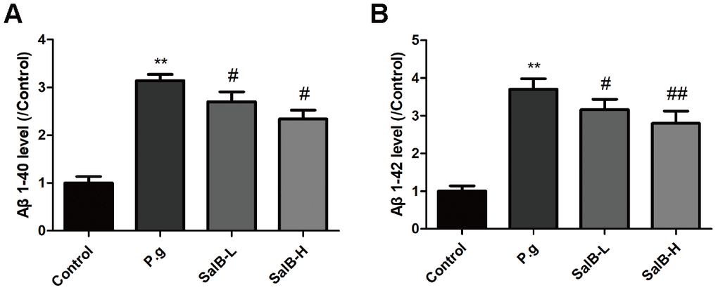 In this study, a new AD model, P. gingivalis-infected mouse model, was employed to investigate the neuroprotective role of SalB. P. gingivalis infection can cause Aβ aggregation and neuroinflammation in the brain, which is similar to AD pathology. Different doses (20 and 40 mg/kg) of SalB were used to treat the mice. We revealed that SalB could obviously protect against P. gingivalis-induced memory deficits by inhibiting neuroinflammation and decreasing Aβ level.