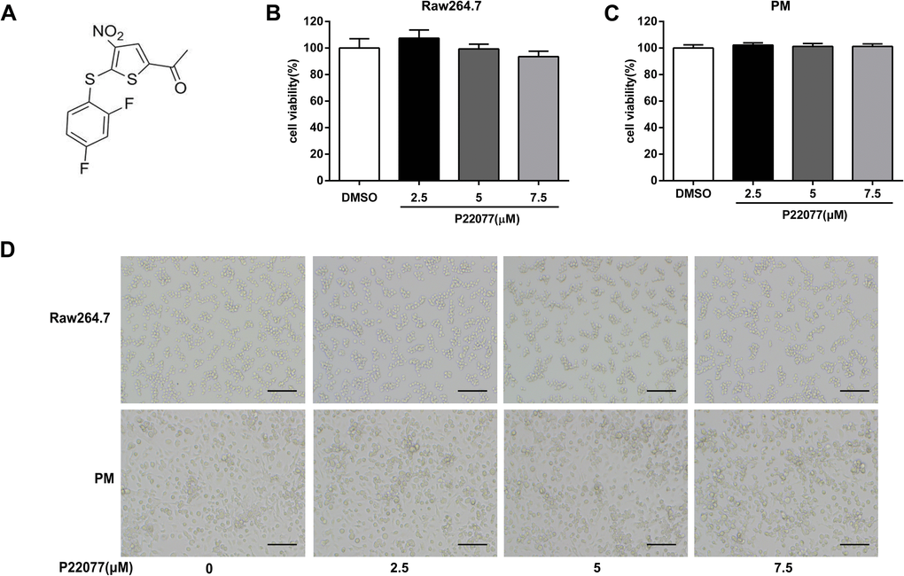 The chemical structure of P22077 was shown in Figure 1A. To determine the cytotoxicity of P22077, MTT assay was used to evaluate the cell viability in macrophages. As shown in Figure 1B, 1C, P22077 (2.5, 5.0 and 7.5 μM) had no significant cytotoxicity both in Raw264.7 cells and mouse peritoneal macrophages. Similarly, no obvious changes were observed in cell density of P22077-treated Raw264.7 cells and mouse peritoneal macrophages (Figure 1D). Therefore, P22077 at these concentrations were selected for the subsequent cellular experiments.