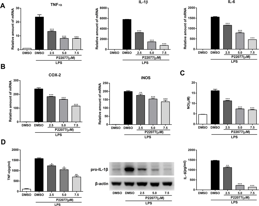 The expression of inflammatory mediators was a crucial response of macrophages with LPS stimulation. To investigate the anti-inflammatory effect of P22077 in macrophages, Raw264.7 cells were exposed to different concentrations of P22077 (2.5, 5.0 and 7.5 μM) and followed by LPS stimulation. The results showed that mRNA levels of TNF-α, IL-1β, IL-6, COX2 and iNOS were highly induced by LPS (100 ng/mL), and the expression of these pro-inflammatory cytokines were significantly decreased (up to 80%) in a dose-dependent manner with pretreated with P22077 (Figure 2A, 2B). Nitric oxide (NO) is a free radical, which is an important inflammatory signaling molecule. To examine the NO production, we use the Griess reagent to investigate the concentration of nitrite which is regard as biomarker of NO in supernatant. As expected, LPS obviously increased the release of NO and this effect could be inhibited by P22077 in a dose-dependent manner with maximum effects of about 50% NO reduction (7.5 μM P22077 compared with LPS alone group) (Figure 2C). Furthermore, we measured pro-inflammatory cytokines TNF-α and IL-6 in the cell culture supernatant by ELISA, and detected pro-IL-1β by immunoblot. The results showed that pretreated with P22077 suppressed the production of LPS-induced TNF-α, pro-IL-1β and IL-6 in Raw264.7 cells (Figure 2D). Taken together, these results indicate that P22077 exhibits anti-inflammatory properties in Raw264.7 cells.