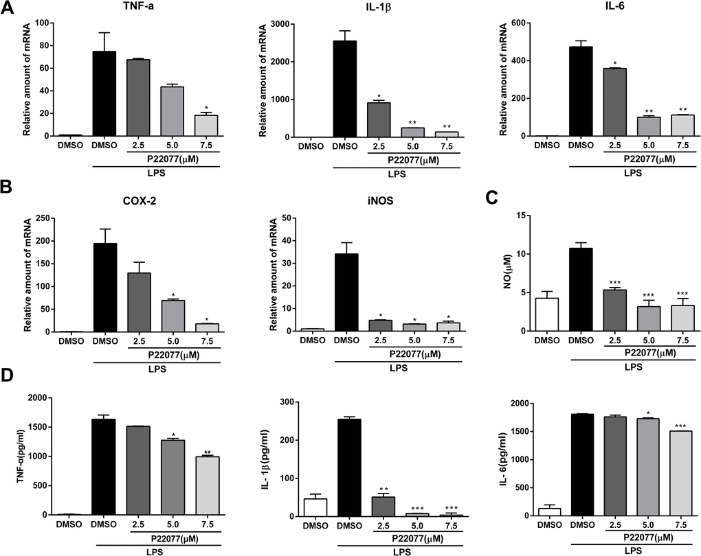 To further confirm the anti-inflammatory effect of P22077 in a primary macrophages, we next studied the inflammatory response of P22077-treated mouse peritoneal macrophages. Q-PCR results showed that P22077 could significantly inhibit LPS-induced TNF-α, IL-1β, IL-6, COX2 and iNOS mRNA levels compared to control group, which is similar with that in Raw264.7 cells (Figure 3A, 3B). Besides, the production of NO, TNF-α, IL-1β and IL-6 in the cell culture supernatant was also significant inhibition by P22077 (Figure 3C, 3D). These results further confirm that P22077 has significant anti-inflammatory potential by suppressing LPS-induced inflammatory mediators production in mouse peritoneal macrophages.