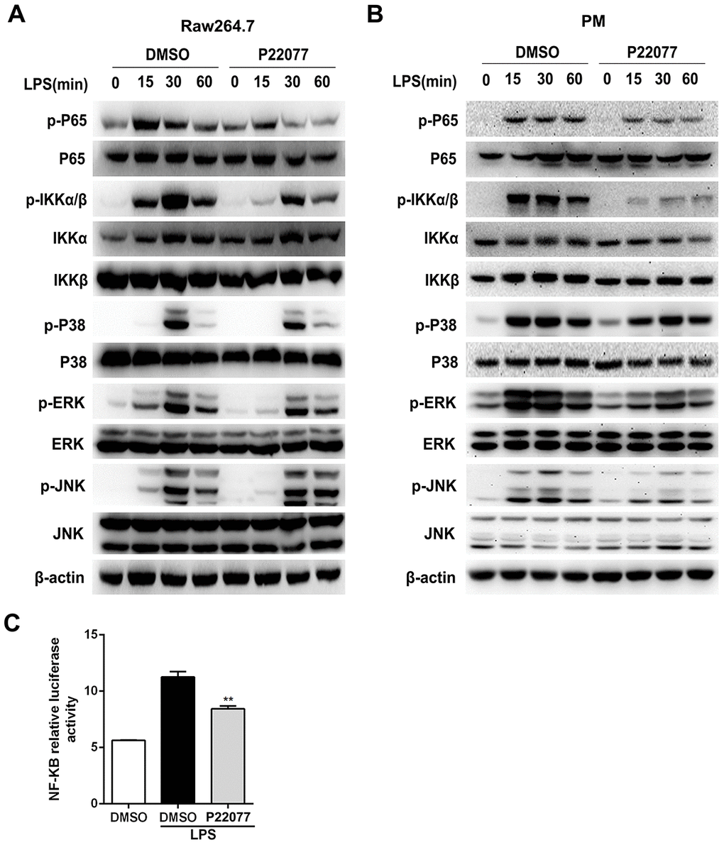 NF-κB and/or MAPKs signaling pathways play an important role in the regulation of innate immunity and inflammation. To determine whether NF-κB and/or MAPKs pathways were involved into the anti-inflammatory response of P22077, we examined the key phosphorylation proteins in NF-κB and MAPKs signaling pathways by immunoblot. The results showed that P22077 treatment inhibited LPS-induced p65 and IKKα/β phosphorylation in Raw264.7 cells (Figure 4A). Besides, P22077 also significantly inhibited LPS-induced phosphorylation of ERK and p38 in Raw264.7 cells (Figure 4A). Similarly, in mouse peritoneal macrophages, we also found that P22077 inhibited LPS-induced p65, IKKα/β phosphorylation in NF-κB signaling pathway and ERK, p38 phosphorylation in MAPKs signaling pathway (Figure 4B). Furthermore, the NF-κB luciferase reporter experiment also indicated that P22077 attenuated the activity of NF-κB signaling pathway (Figure 4C). Taken together, these findings reveal that P22077 suppresses LPS-induced inflammatory response by inhibiting the activation of NF-κB and MAPKs signaling pathways.