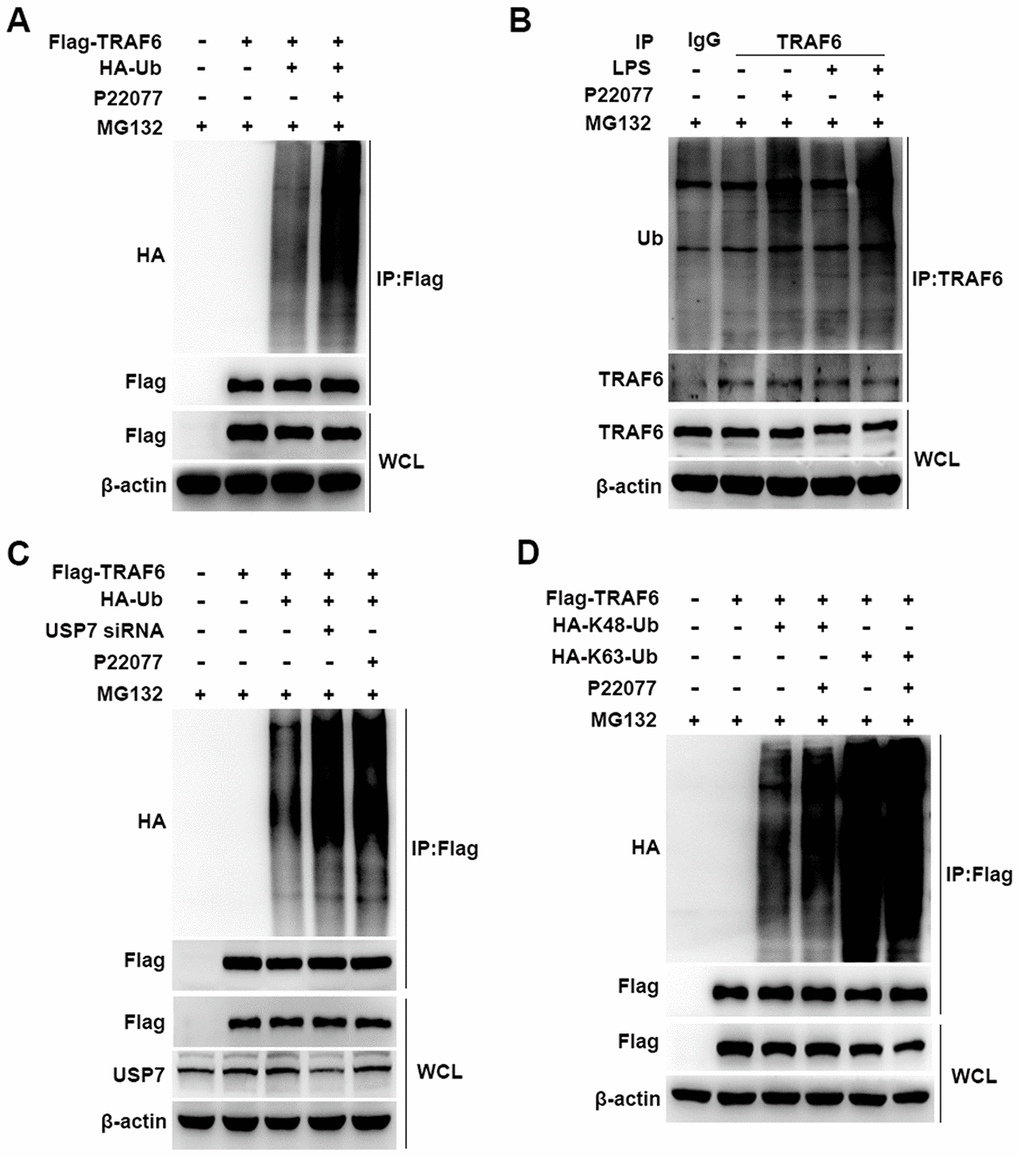 Having shown that P22077 promotes TRAF6 degradation in a proteasome- dependent manner, we further studied the cellular function of P22077 toward TRAF6. Flag-TRAF6 plasmid and HA-Ub plasmid were co-transfected into HEK293T cells with following MG132 and P22077 treatment. We found that P22077 significantly increased the ubiquitination level of TRAF6 (Figure 6A). In mouse peritoneal macrophages, we also confirmed these results. Ubiquitination assay showed that TRAF6 ubiquitination was significantly increased in mouse peritoneal macrophages pretreated with P22077 (Figure 6B). In addition, the ubiquitination level of TRAF6 was elevated both in P22077 treated and USP7 knockdown cells (Figure 6C). Subsequently, to study the form of ubiquitination chains linking to TRAF6, HEK293T cells were transfected with Lys-mutated ubiquitin plasmids (K48 or K63). The mutated K48 or K63 sites ubiquitin has only one lysine in ubiquitin at position 48 or 63, respectively. Ubiquitination assay demonstrated that P22077 significantly increased K48-linked but not K63-linked ubiquitination of TRAF6 (Figure 6D). Taken together, these data indicate that P22077 promotes K48-linked polyubiquitination-dependent degradation of TRAF6.