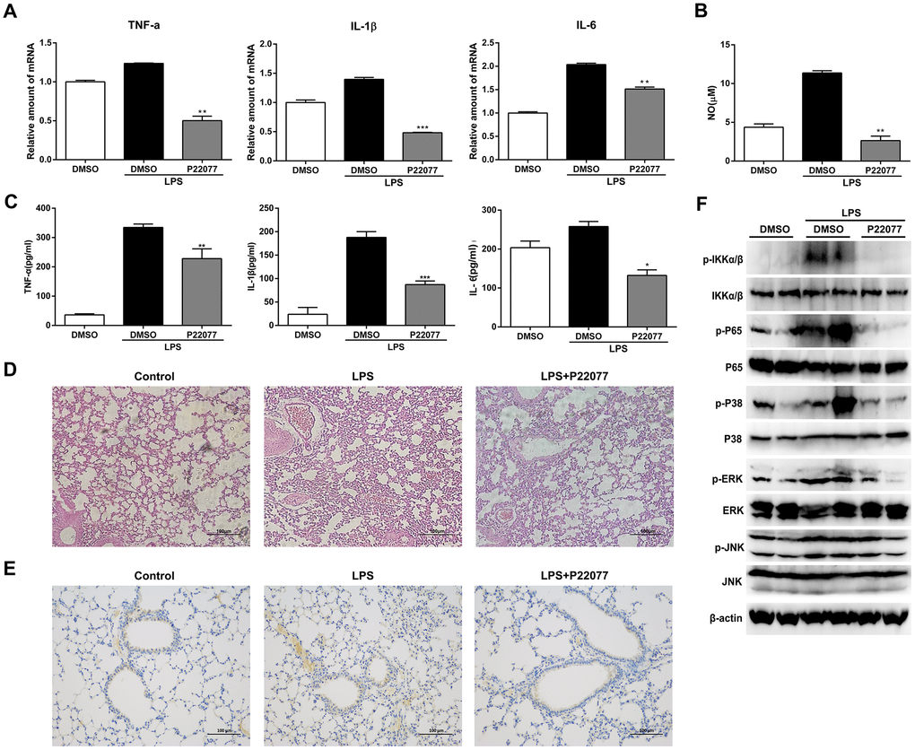 To investigate the anti-inflammatory properties of P22077 in vivo, we induced a systemic acute inflammation mice model by LPS intraperitoneal injection [30–32]. It is characterized by overproduction of inflammatory cytokines and leads to the lethal multiple organ damage after LPS stimulation. Before LPS challenge, C57BL/6 mice were intraperitoneally injected with P22077 (15 mg/kg) or vehicle DMSO. Two hours after LPS challenge, mice were sacrificed to obtain serum and lung. As shown in Figure 7A, P22077 treatment suppressed mRNA expression of pro-inflammatory cytokines such as TNF-α, IL-1β and IL-6 in lung tissue. In addition, compared to control group, the serum levels of NO, TNF-α, IL-1β and IL-6 were decreased in the mice treated with P22077 (Figure 7B–7C). H&E staining of lung tissue showed that P22077 treatment reduced LPS-induced pulmonary interstitial edema and inflammatory infiltrates (Figure 7D). Immunohistochemistry staining of TRAF6 in lung tissue suggested that LPS induced the expression of TRAF6, but when treated with P22077, the protein of TRAF6 was significantly reduced (Figure 7E). We also examined the key phosphorylation proteins in NF-κB and MAPKs signaling pathways in lung tissue, the results suggested that the phosphorylation of IKKα/β, p65 in NF-κB signaling pathway, and p38, ERK in MAPKs signaling pathway were significantly decreased in P22077 treated mice, as observed in Raw264.7 cells and mouse peritoneal macrophages (Figure 7F). These data indicate that P22077-treated mice were more resistant to LPS-induced inflammation and lung injury.