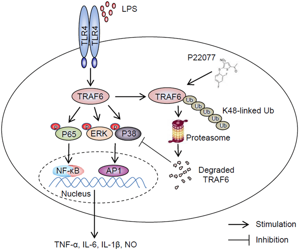 In conclusion, we demonstrate that P22077 can promote K48-linked ubiquitination and degradation of TRAF6 and then inhibit the activation of NF-κB and MAPKs signaling pathways, and then negatively regulates inflammatory response. These findings provide a new insight into the small-molecule compounds for inhibition of NF-κB and MAPKs-mediated inflammation and provides a new potential anti-inflammatory drug to cure infection-related inflammatory and autoimmune diseases.