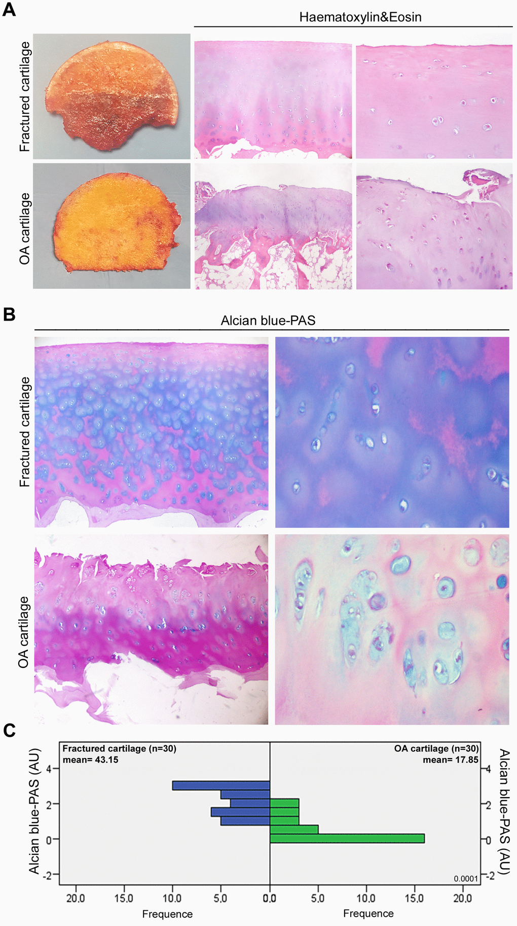 We primarily investigated the macroscopic and microscopic features of articular cartilage. As shown in Figure 1A, articular cartilage of fractured patients appeared morphologically and microscopically normal; in contrast, OA cartilage appeared thinned and damaged, with an evident chondrocyte disorganization. OA cartilage damage was confirmed by analyzing the extracellular glycosaminoglycan accumulation (Figure 1B). In fact, Alcian blue-PAS staining in Figure 1C documented a glycosaminoglycan reduction in OA patients compared with fractured ones (P < 0.0001), indirectly confirming the extracellular matrix degradation in joint cartilage of OA patients. Data from each patient are reported in Supplementary Tables 1, 2.
