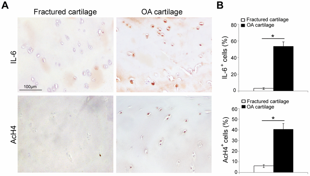In order to confirm the “active” inflammatory and transcriptional status of osteoarthritic cartilage [25–27], we evaluated by immunohistochemistry the expression of pro-inflammatory cytokine IL-6 and acetyl-histone H4 (AcH4), indicator of transcriptional activity, in articular cartilage of fractured and OA patients. As reported in Figure 2, IL-6 immunopositivity was greater in OA chondrocytes than in those of fractured patients (P < 0.001); in the latter, IL-6 expression was barely perceptible or absent. We also documented a higher percentage of AcH4 positive nuclei in OA chondrocytes compared with those of fractured patients (P < 0.001). Data from each patient are reported in Supplementary Tables 1, 2.