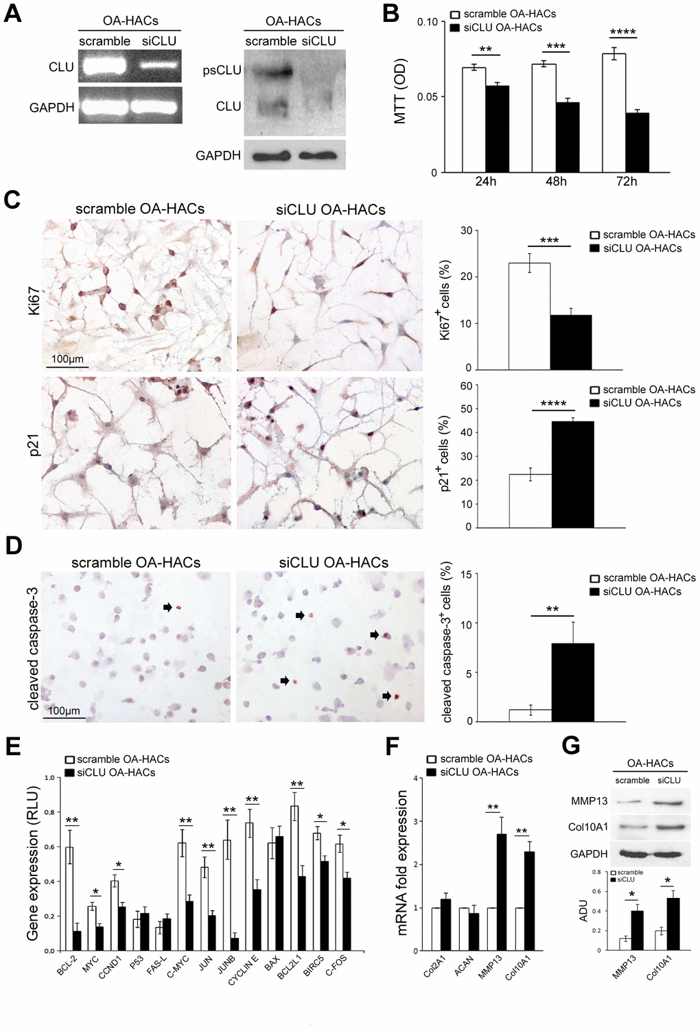Based on the increased expression of CLU in OA-HACs, we investigated the effect of CLU gene silencing by siRNA transfection. As shown in Figure 5A, treatment with siCLU induced a knockdown of cellular CLU mRNA and protein levels in OA-HACs; conversely, no change in CLU expression was observed in the presence of control siRNA (scramble treatment). As reported in Figure 5B, CLU silencing reduced the viability of OA-HACs compared with scramble-transfected ones, already after 24 h (P < 0.01), and more markedly after 48 and 72 h of treatment (P < 0.001 and P < 0.0001, respectively). Immunocytochemical analysis (Figure 5C) showed a reduced Ki67+ and an increased p21+ percentage of cultured OA-HACs after CLU silencing compared to scramble after 72h (P < 0.001 and P < 0.0001, respectively). CLU-silenced OA-HACs showed an increase of cleaved caspase-3 positive cells (Figure 5D; P < 0.01). Altogether, these results suggested that CLU reduction by silencing decreases proliferation and increases cell death of OA-HACs.