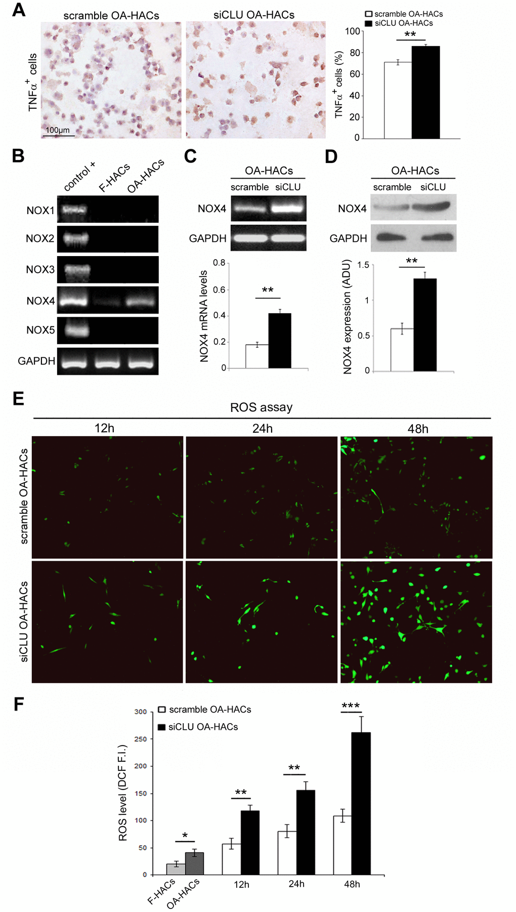 Next, we analyzed the presence of NADPH oxidase (NOX) isoforms in cultured HACs, confirming NOX4 as the only isoform in human chondrocytes [11]. As reported in Figure 6B, higher NOX4 transcriptional levels were documented in OA-HACs compared to F-HACs. Then, we analyzed the effect of CLU silencing on NOX4 expression. As reported in Figure 6C, 6D, Nox4 mRNA and protein levels in CLU-silenced OA-HACs were greater than in scramble (P < 0.01). We also assessed the effect of CLU silencing on ROS accumulation. CLU silencing in OA-HACs induced a stronger fluorescence signal compared with scramble already after 12 h and more markedly after 48 h (Figure 6E, 6F; P < 0.001). In addition, as reported in Figure 6F, ROS levels were increased in OA-HACs compared with F-HACs (P < 0.05).