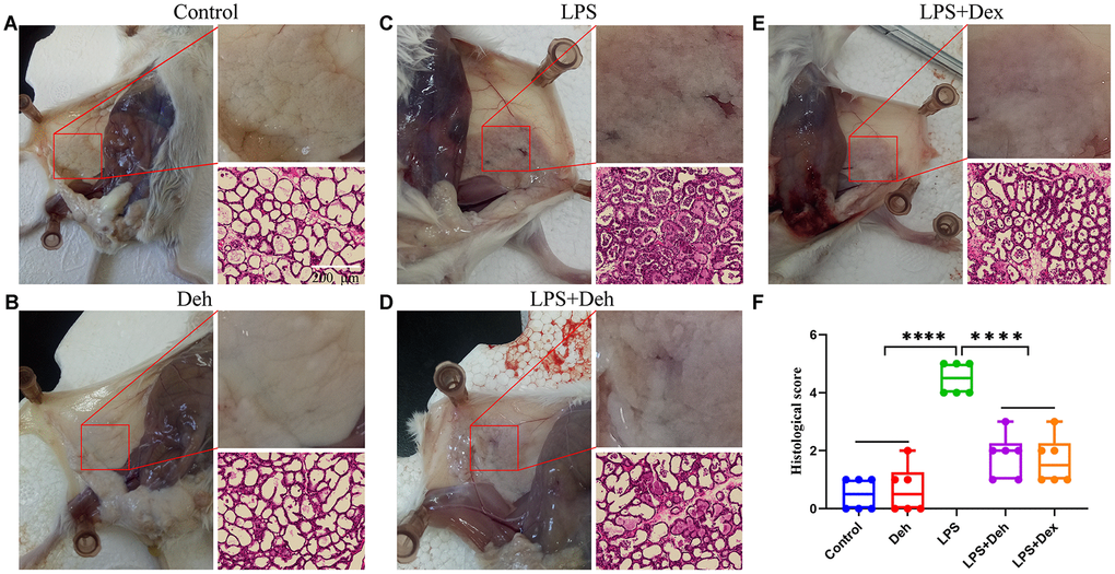 First, we took pictures of the mammary glands and observed damage to the mammary glands in mice. Then, we collected the mammary glands and stained them with H&E. Dexamethasone (Dex) was used as a positive control to effectively alleviate mastitis [11]. The results showed that the mammary glands of the control and Deh groups had no pathological changes (Figure 1A, 1B), while those of the LPS group had obvious edema and hyperemia (Figure 1C). The pathological symptoms of the LPS + Deh group and LPS + Dex group were significantly improved (Figure 1D–1E). The H&E results were also consistent with the previous results. There was no neutrophil infiltration in the Control or Deh groups (Figure 1A, 1B). In the LPS group, there was substantial neutrophil infiltration in the acini (Figure 1C). In the LPS + Deh and LPS + Dex groups (Figure 1D, 1E), neutrophil infiltration in the acini was significantly decreased. The histological scores showed that Deh significantly alleviated LPS-induced mouse mastitis, which was consistent with the results of the positive control group (Figure 1F).