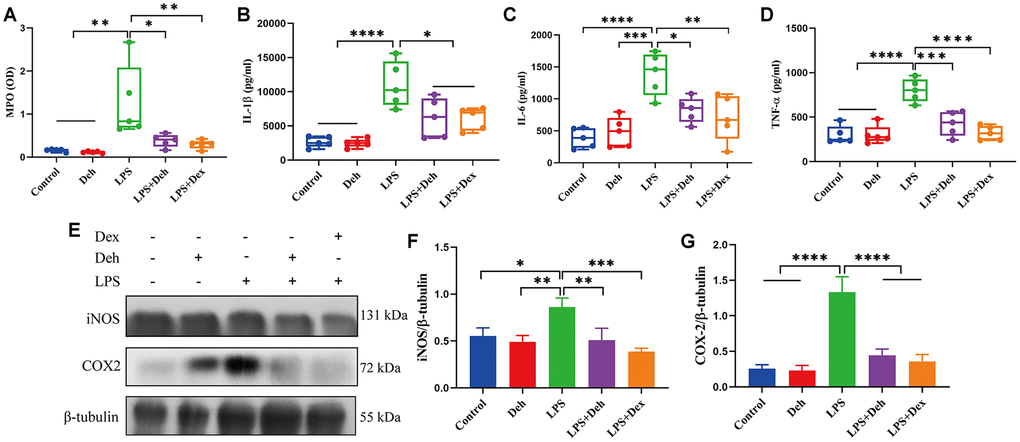 MPO, COX2, iNOS, IL-6, IL-1β and TNF-α are important indicators of inflammation. Our results showed that the MPO activity and the protein levels of COX2, iNOS, IL-6, IL-1β and TNF-α in the mammary glands of the LPS group were significantly higher than those in the LPS + Deh and LPS + Dex groups (Figure 2A–2G). This result indicates that Deh significantly reduces the inflammatory response of the mammary gland.