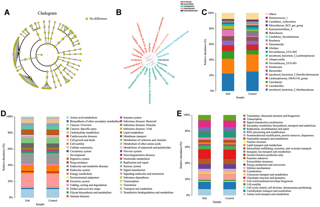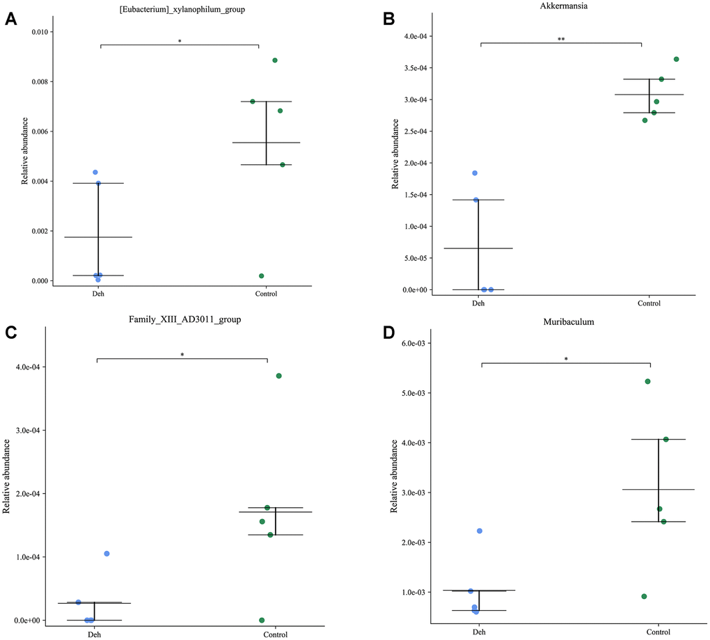 The line discriminant analysis (LDA) effect size results showed that there were no significantly different microbial groups among the different groups (Figure 3A). Figure 3B is the phylogenetic tree of the species. The species distribution histogram showed that the relative species content between the two groups did not change much, and Deh did not change the relative species content (Figure 3C). The results of KEGG and GO analysis showed that there was no significant difference in functional genes and metabolic pathways between the two groups (Figure 3D, 3E). Although Deh did not change the main structure of the intestinal flora, it did affect the levels of some flora. At the genus level, the abundances of the family XIII AD3011 group, [Eubacterium] xylanophilum group, Akkermansia and Muribaculum in the Deh group were lower than those in the control group (Figure 4A–4D). At the species level, Parabacteroides sp. YL27, [Eubacterium] xylanophilum group, Family XIII AD3011 group and Akkermansia in the Deh group were lower than those in the Control (Supplementary Figure 2A–2D).