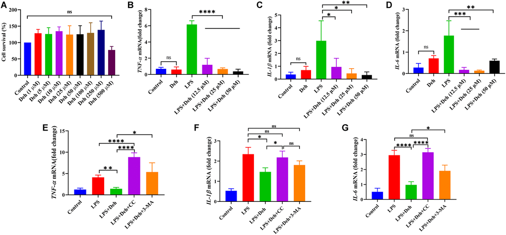 TRIzol, LPS and phenylmethanesulfonyl fluoride (PMSF) were purchased from Sigma (Saint Louis, MO, USA). Deh was purchased from Shanghai Yuanye Bio-Technology Co. CCK8 was purchased from Saint-Bio Co. (Shanghai, China). Compound C (CC) and 3-methyladenine (3-MA) were purchased from Selleckchem (Shanghai, China). p-Beclin, Beclin, p-ULK, ULK, AMPK, p-AMPK and LC3B were purchased from Cell Signaling Technology (Boston, MA, USA). P62 was purchased from Proteintech (Rosemont, IL, USA). β-Tubulin was purchased from Bosterbio in Dallas (Pleasanton, USA). IgG was purchased from Beyotime (Shanghai, China). HRP-conjugated anti-mouse and anti-rabbit secondary antibodies were purchased from Bosterbio.