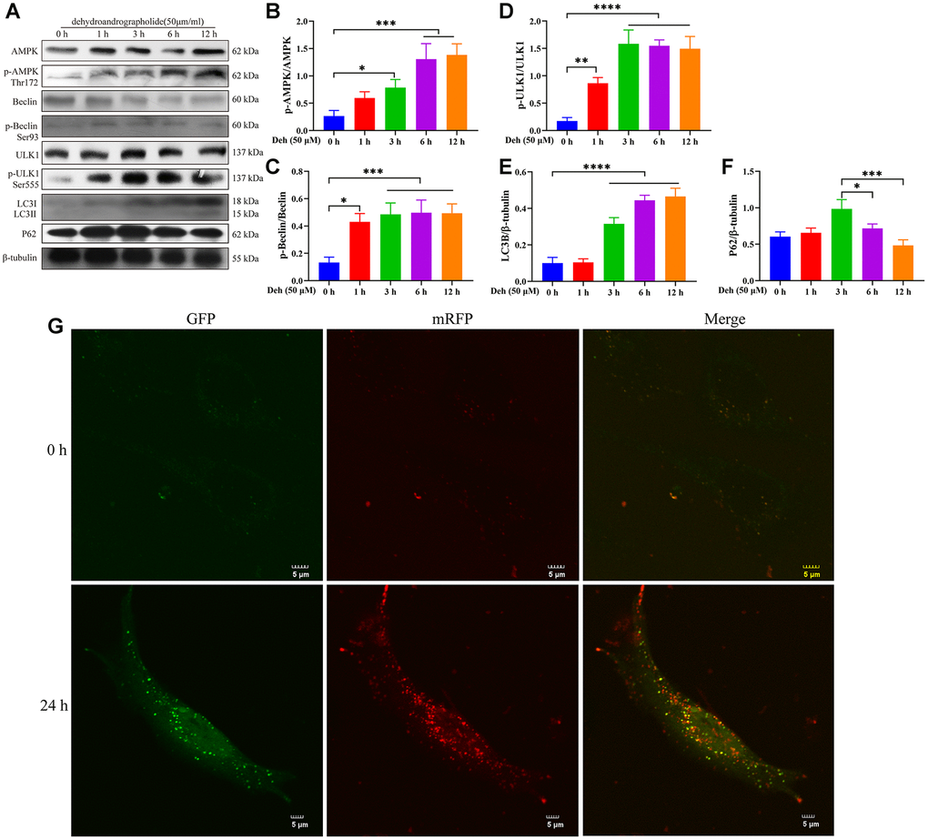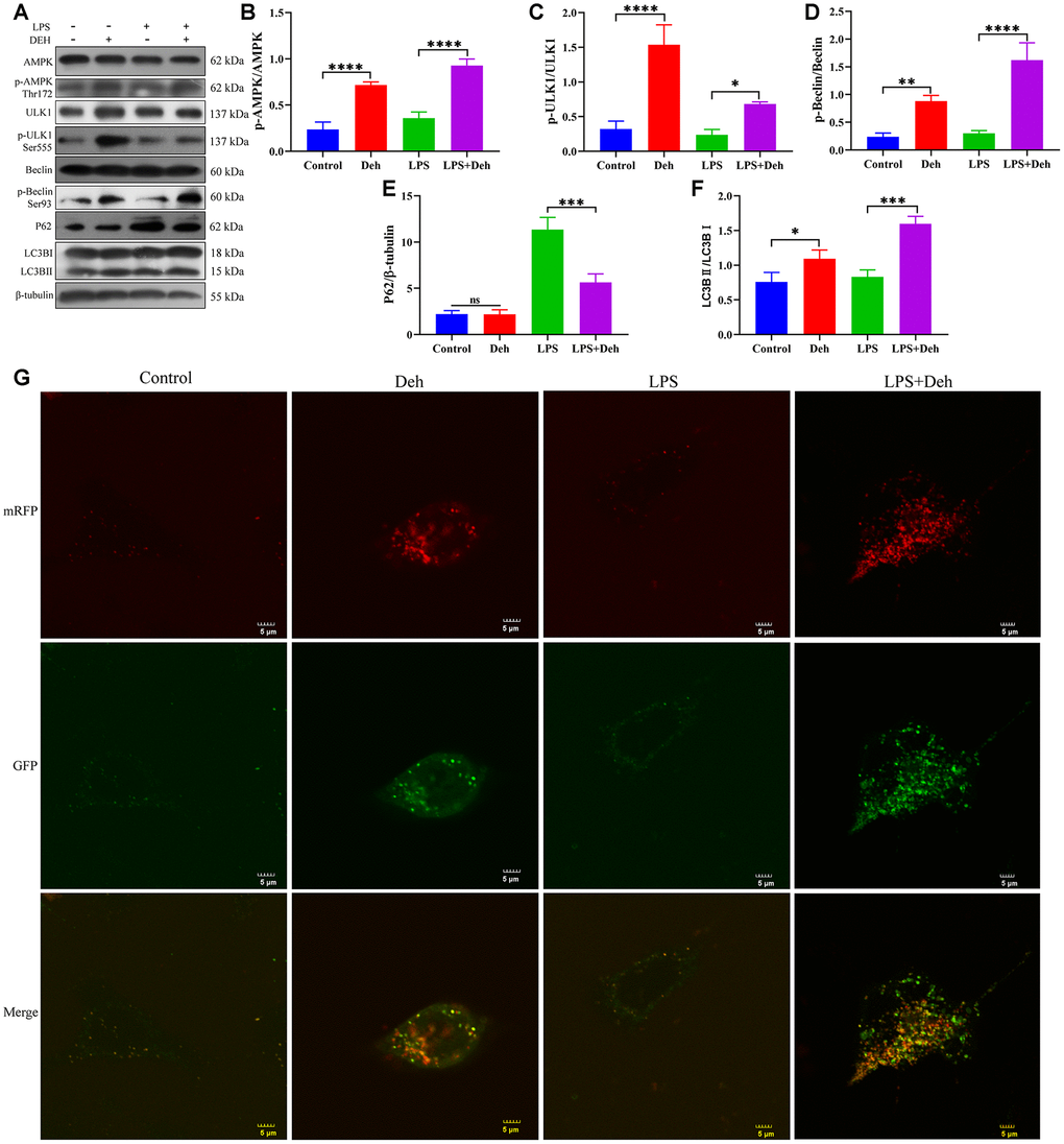 Previous results showed that Deh activates autophagy through the AMPK signaling pathway [21]. To verify that autophagy plays an important anti-inflammatory role in Deh, we next tested whether Deh promoted autophagy in an inflammatory response model of EpH4-Ev cells. We detected the protein levels of p-AMPK, p-Beclin, p-ULK1, P62, LC3B and autophagic flux in the EpH4-Ev cell inflammatory response model. The results showed that the protein levels of p-AMPK, p-Beclin, p-ULK1 and LC3B in the Deh and Deh + LPS groups were significantly upregulated, and p62 was significantly downregulated (Figure 8A–8F). The autophagic flux in the Deh and Deh + LPS groups was also significantly enhanced (Figure 8G).