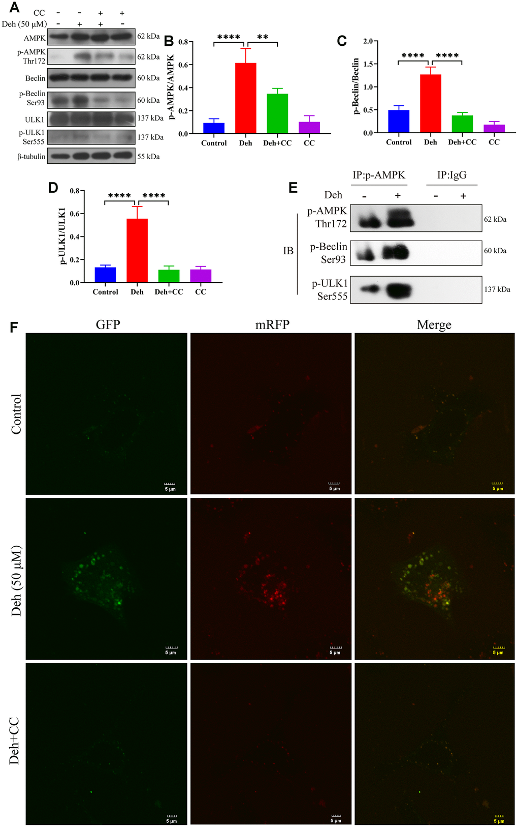 Previous studies have shown that p-AMPK promotes autophagy through phosphorylation of AMPK, Beclin and ULK1. Autophagy plays an important role in inhibiting the inflammatory response. To further study the anti-inflammatory mechanism of Deh, we first detected whether Deh activated autophagy through AMPK signaling in EpH4-Ev cells. Our results showed that Deh significantly promoted the phosphorylation of AMPK, Beclin and ULK1 at 3 h, 6 h and 12 h (Figure 6A–6D). Moreover, Deh significantly promoted the degradation of p62 and increased LC3B (Figure 6E, 6F). The immunofluorescence results showed that autophagy was highest in the Deh group at 24 h (Figure 6G). We further detected the protein levels of p-AMPK, p-Beclin and p-ULK1 after adding the AMPK inhibitor CC. The results showed that the protein levels of p-AMPK, p-Beclin and p-ULK1 in the Deh + CC group were significantly lower than those in the Deh group (Figure 7A–7D); Deh did not enhance the autophagic flux of EpH4-Ev cells (Figure 7F). In addition, the Co-IP results suggested that Deh significantly promoted the phosphorylation of AMPK, while the phosphorylation of AMPK significantly enhanced the phosphorylation of Beclin and ULK1 (Figure 7E). These results showed that Deh activates autophagy by AMPK.