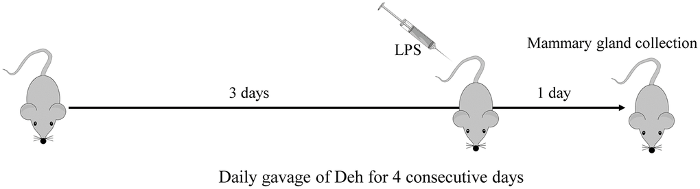 ICR mice (8~10 weeks old, 25~30 g weight) were purchased from the Center of Experimental Animals of Baiqiuen Medical College of Jilin University (Jilin, China). The animals were housed in certified, standard laboratory cages and administered food and water ad libitum before experimental use. All animal care and experimental procedures were conducted in accordance with the guidelines established by the Jilin University Institutional Animal Care and Use Committee (approved on 27 February 2015; Protocol No. 2015047) designated ‘Guide for the Care and Use of Laboratory Animals’ and approved by the Institutional Animal Care and Use Committee of Jilin University. Animal studies were performed in compliance with ARRIVE guidelines. Lactating mice (5~7 days after birth of offspring) were randomly divided into five groups: control (n=6), Deh (100 mg/kg), LPS (0.2 mg/mL, 50 μL) treatment (n=6), LPS + Deh (100 mg/kg) (n=6), and LPS+Dex (5 mg/kg) (n=6). On day four of lactation, the control group was fed normal saline, and the two treatment groups were fed Deh (100 mg/kg) for 4 days. On day 3, LPS was injected into the fourth inguinal mammary gland of the mice. At 24 h after LPS injection, the mice were anesthetized with sodium pentobarbital (45 mg/kg), and the mammary glands were collected (Figure 9).