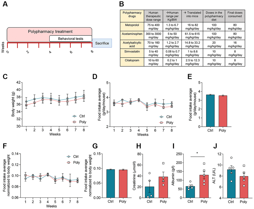 The polypharmacy treatment was well-tolerated and no signs of illness or mortality among the mice were observed over the study period. During the eight weeks of treatment, all the mice gradually increased in body weight (Figure 1C), as normal for young adult animals. There was no significant difference in body weight between control and polypharmacy group. Food intake (FI) average was also checked weekly without any significant difference between groups. FI was measured as weekly average (Figure 1D) and as total average over the study period (Figure 1E); moreover, we performed the same analysis normalized to the mouse body weight (Figure 1F, 1G). Mice consumed about 20% less than the anticipated FI and the final doses of administered drugs were: 80 mg/Kg/day metoprolol, 80 mg/Kg/day acetaminophen, 16 mg/Kg/day acetylsalicylic acid, 8 mg/Kg/day simvastatin and 8 mg/Kg/day citalopram. These final drug concentrations result to be within the therapeutic dose range in humans, as reported in the table in Figure 1B. The table shows human therapeutic dose range intervals per each compound and the corresponding interval translated into mice, followed by the final doses consumed by the animals (calculation of human-to-mouse dose translations is explained in the methods).