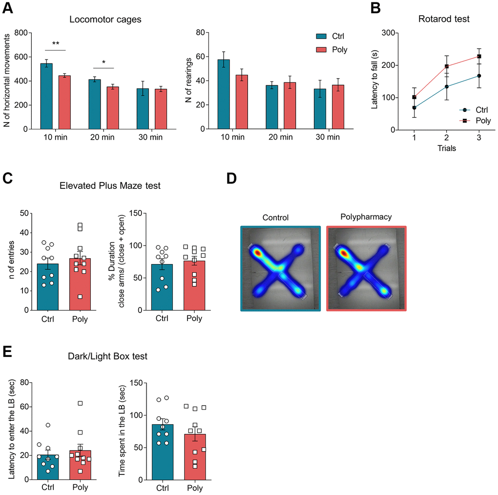 The multiple-medication regimen did not significantly affect locomotor functions and coordination assessed with total OF analysis and Rotarod test, respectively. Likewise, anxiety-like behavior experiments (EPM and DLB tests) did not point out differences between polypharmacy and control groups and similar performances were also observed when testing the mice for non-spatial and contextual memory.