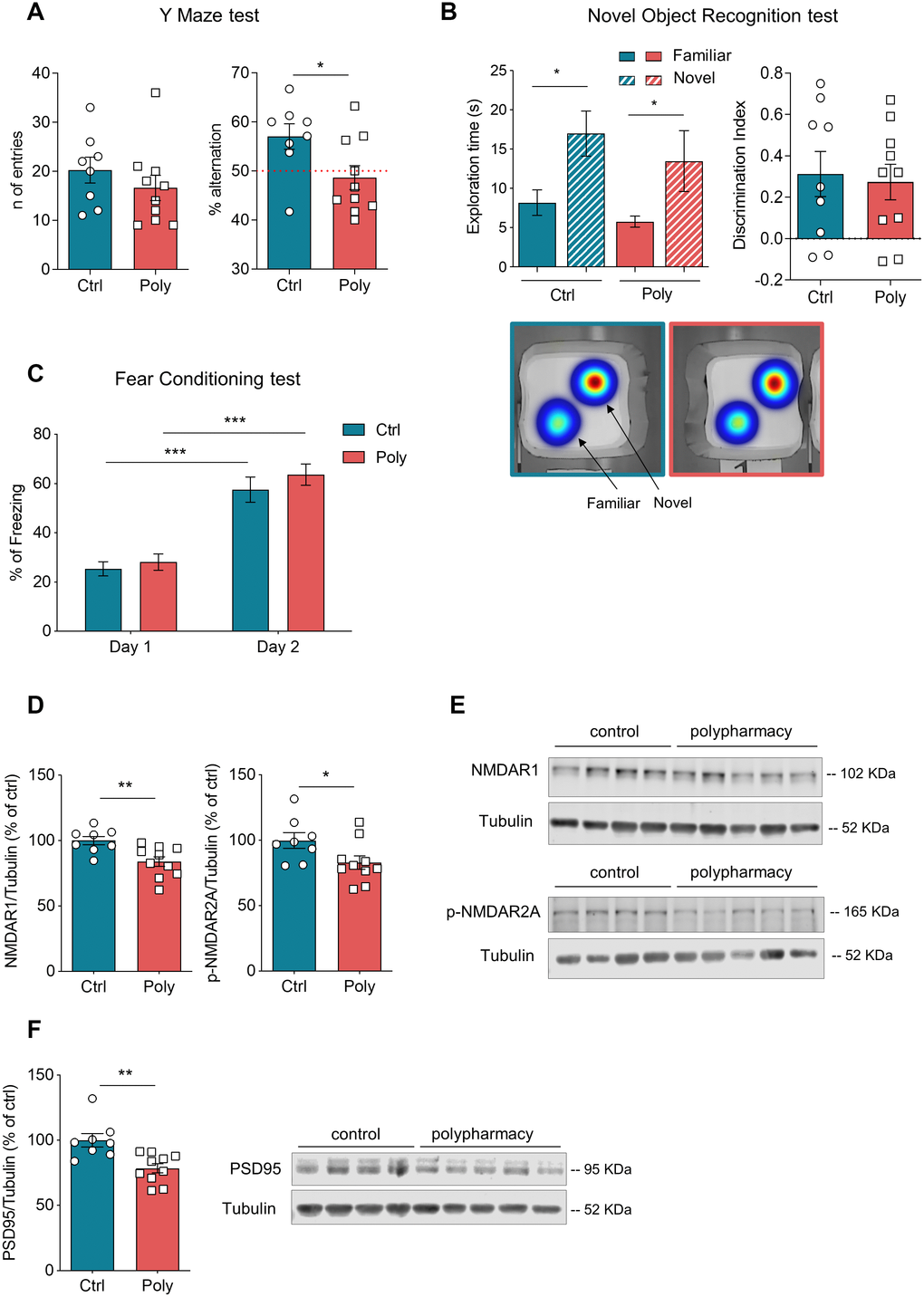 When the groups of mice were assessed for behavior, we observed for the first time that the concomitant use of different medications is able to affect critical functions at young adult age. We found that chronic administration of polypharmacy induced impairments in explorative behavior measured as reduced horizontal movements during OF test. When exposed to a new environment (such as the OF arena), rodents are willing to explore the novel area by innate behavior. A decrease in exploration reveals lack of curiosity and investigatory behavior which in healthy animals should be spontaneously present [40]. That can correlate to several variables as increased fear/anxiety or emotional factors [41] but can also be independent from anxiety-related components [42]. Moreover, we are the first to show that chronic exposure to five different medications affects spatial working memory, as emerged from the Y maze test, already in young adult mice. The significant deficit observed in the spatial memory test was further supported by the analysis of postsynaptic proteins in the hippocampus, which were found to be significantly decreased in treated mice. NMDA receptors and PSD95 complex are key contributors in synaptic plasticity and important mediators of many forms of memory and learning [30, 43]. Such experimental findings are novel and highly support epidemiological studies reporting that polypharmacy increases the probability of developing cognitive decline and disturbances in older adults [14, 16]. This suggests that our mouse model of polypharmacy has translatable findings and more in-depth studies are needed to investigate the possible mechanisms behind the reduction of synaptic proteins induced by polypharmacy.