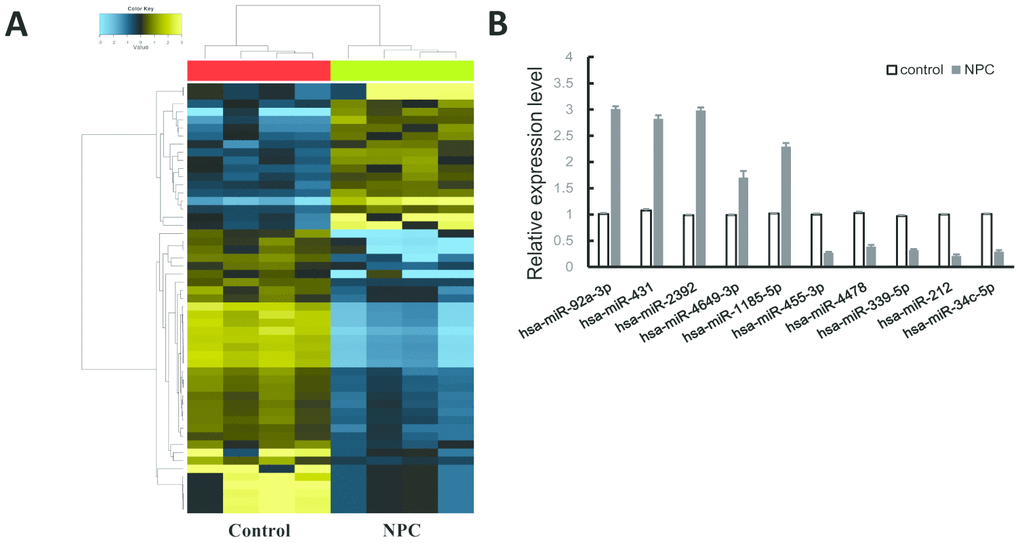 A total of 102 differentially expressed miRNAs were identified in NPC samples by bioinformatics tools, including 39 up-regulated miRNAs and 63 down-regulated miRNAs (|FC| > 1.5, P-value < 0.05). The hierarchical cluster analysis revealed evident expression pattern of abnormally expressed miRNAs between NPC and control group (Figure 1A). Top 20 dysregulated miRNAs with significant expression changes was listed in Table 1. To verify the reliability of sequencing data, we randomly selected 10 miRNAs (up-regulated: hsa-miR-92a-3p, hsa-miR-431, hsa-miR-2392, hsa-miR-4649-3p, hsa-miR-1185-5p; down-regulated: hsa-miR-212, hsa-miR-34c-5p, hsa-miR-455-3p, hsa-miR-4478, hsa-miR-339-5p) to measure their expression by qRT-PCR experiment. The results were consistent with sequencing data (Figure 1B).