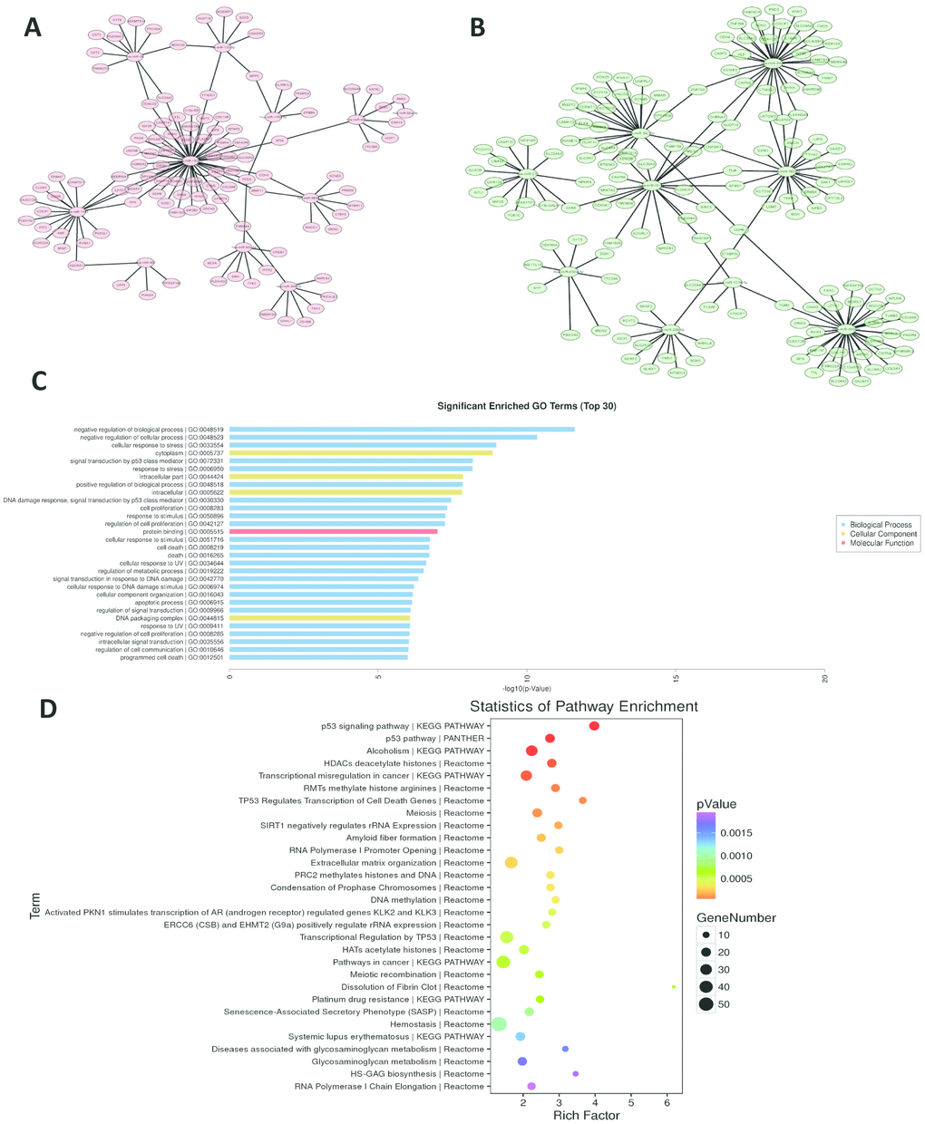 Based on NPC mRNAs expression data from GEO dataset (GSE126683), the Pearson Correlation between top 20 differentially expressed miRNAs and mRNAs was calculated. The miRNAs-mRNAs pairs with negative correlation were further screened by miRWalk3.0 database (Supplementary Table 1). As shown in Figure 2A, 2B, the up-/down-regulated miRNAs-mRNAs pairs were displayed. Several hub-miRNAs with more than fifteen target genes may play crucial roles during NPC pathogenesis (miR-182, miR-1183, miR-34c-5p, miR-4479, miR-185-3p and miR-455-3p), especially miR-182, which has the highest number of target genes.