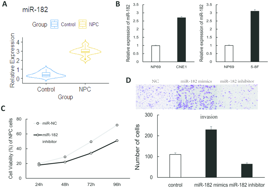To explore the role of miR-182 in NPC, the expression level of miR-182 was measured in 32 NPC patient samples and 20 control samples by qRT-PCR assay. We found that miR-182 expression was significantly increased in NPC group (Figure 3A). Validation of miR-182 expression in two NPC cell lines (CNE1 and 5-8F) showed consistent results (P < 0.01) (Figure 3B). To further explore the biological function of miR-182, the validated target genes were extracted from miRWalk3.0 database and further subjected for functional enrichment analysis (GO and KEGG). The significant enriched GO terms (P < 0.05) were obtained in Figure 2C, including negative regulation of biological process, signal transduction by p53 class mediator and regulation of cell proliferation. MiR-182 mediated pathways were mainly participated in p53 signaling pathway, transcriptional misregulation in cancer and DNA methylation (P < 0.05) (Figure 2D). Moreover, we examined the correlation between miR-182 expression and NPC clinical outcomes by Chi-square test. The results indicated that high expression of miR-182 was strongly correlated with TNM stage (P-value = 0.008) and lymph node migration (P-value = 0.002) in NPC patients (Table 2).