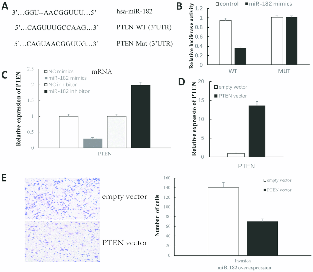 Total RNA was isolated from tissue samples or cells using Trizol, then complementary DNA (cDNA) was obtained using TaqMan MiRNA Reverse Transcription kit (ThermoFisher, Waltham, MA). The primers were synthesized and designed by Biotech Company (Biotech, Shanghai, China). MiR-182: (forward) 5′-TTTACGCGTGTTGTTGTTGAGACAGAATCTCGCT-3′ and (reverse) 5′-TTTAAGCTTCCTGCCGACCCTGCGGAGAGA-3′; PTEN: (forward) 5′-AATTCCCAGTCAGAGGCGCTATGT-3′ and (reverse) 5′-GATTGCAAGTTCCGCCACTGAACA-3′). The qRT-PCR experiment was conducted with SYBR Green qPCR Mix (Fermentas) according to the instruction. The expression of miRNAs was normalized to U6. GAPDH was used to normalize the expression of mRNAs.
