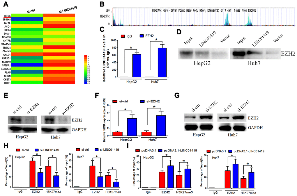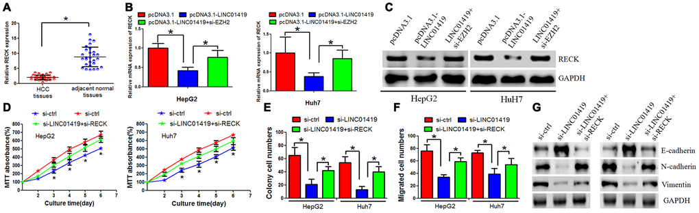 This study determined the biological role of RECK in HCC cells. It was reported that the RECK-mRNA expression level decreased in HCC tissues when compared with the adjacent normal tissues (Figure 5A). Subsequently, we investigated the potential role of RECK in mediating LINC01419 function in HCC cells. When LINC01419 was overexpressed in HepG2 and Huh7 cells, decreased expression level of RECK was noted (Figure 5B and 5C). However, RECK inhibition by LINC01419 was reversed at mRNA and protein levels. This occurred after EZH2 down-regulation with si-RNAs (Figure 5B and 5C). A rescue assay was performed by co-transfecting HCC cells with LINC01419 and RECK siRNAs. This explored the underlying effects of LINC01419/RECK on cell growth and invasion. It was revealed that RECK down-regulation partially reversed the effect of LINC01419 down-regulation on growth and migration (Figure 5D–5F). We also overexpressed RECK in HCC cells and found that RCEK decreased cell growth and migration ability (Supplementary Figure 2E–2G). In addition, we found that inhibition of LINC01419 elevated RECK expression level (Supplementary Figure 2H).