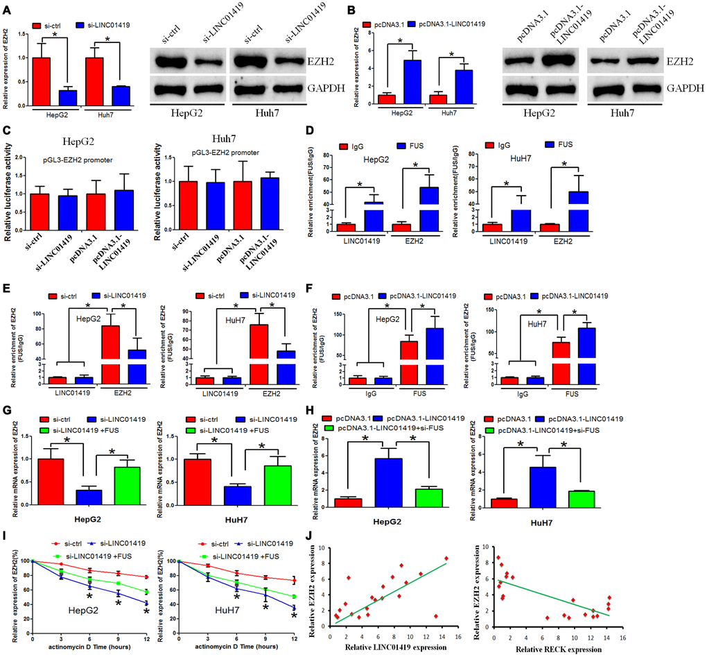 The mechanism of LINC01419 in modulating EZH2 in HCC was explored. Expression of mRNA and protein levels of EZH2 decreased when LINC01419 was inhibited, whereas, it increased when LINC01419 was overexpressed (Figure 4A and 4B). From this, it was proved that LINC01419 positively regulates EZH2 inHCC. However, down-regulation or up-regulation of LINC01419 significantly did not affect the luciferase activity of the EZH2 promoter, as revealed in HepG2 and Huh7 cells (Figure 4C). Therefore, it was proposed that LINC01419 takes part in the post-transcriptional regulation of EZH2 in HCC. Reports from the literature indicate that RNA-binding protein (RBP) complicit lncRNA-regulated gene expression. The RBP, FUS, was shown to interact with LINC01419 and EZH2-mRNA, this was verified with the starBase 2.0 (http://starbase.sysu.edu.cn/starbase2/index.php). This study determined whether FUS enhanced EZH2 expression inLINC01419. Through RIP analysis, it was reported that LINC01419 and EZH2 were significantly captured by FUS in HepG2 and Huh7 cells (Figure 4D). In addition, FUS bound EZH2-mRNA levels decreased significantly with LINC01419 silencing, whereas, the levels increased with LINC01419 overexpression (Figure 4E and 4F). The role of LINC01419 in inhibiting or stimulating EZH2 expression in HCC cells is partially offset through FUS up-regulation or down-regulation (Figure 4G and 4H). Besides, LINC01419 down-regulation accelerated the degradation rate of EZH2-mRNA.This effect was reversed through forced FUS expression (Figure 4I). These results suggested that LINC01419 regulates EZH2-mRNA stability, and this is mediated by FUS. Furthermore, a positive correlation between LINC01419 expression level and the EZH2 expression level was noted (Figure 4J, left panel). However, a negative correlation existed between the EZH2 expression level and RECK expression level (Figure 4J, right panel).