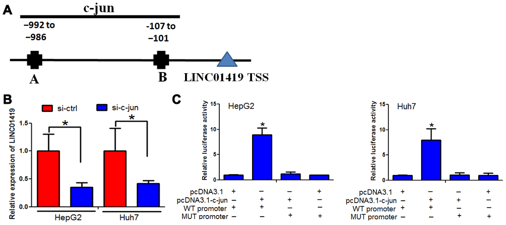 Furthermore, we determined whether c-jun modulates LINC01419 expression. c-jun down-regulation by si-RNAs inhibited LINC01419 in HCC cells (Figure 6B). To confirm c-jun binding at the LINC01419 promoter, chromatin immune-precipitation and q-PCR assays were performed. When c-jun was overexpressed, luciferase activity in wild-type LINC01419 promoter increased (Figure 6C). However, c-jun overexpression had no significant effect on luciferase activity when c-jun binding sites on LINC01419 were mutated (Figure 6C). Based on these results, it was suggested that c-jun binding to the LINC01287 promoter positively regulates its expression.