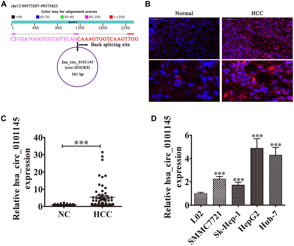 The hsa_circ_0101145 is derived from DOCK9 gene exons, which are located at chr13:99573207-99575625. DOCK9 consists of 24,186 bp and the spliced mature circRNA is 301 bp (Figure 1A). FISH revealed that hsa_circ_0101145 expression in HCC tissues was increased compared with adjacent normal tissues. The hsa_circ_0101145 was predominantly localized to the cytoplasm (Figure 1B). We then chose 60 pairs of human HCC and adjacent normal tissues for hsa_circ_0101145 expression analysis. qRT-PCR analysis confirmed that hsa_circ_0101145 expression increased in human HCC tissues compared with adjacent normal tissues (Figure 1C). We divided samples into high- (greater than adjacent normal tissues; n = 27) and low- (less than adjacent normal tissues; n = 33) expressing groups. There were no associations between hsa_circ_0101145 expression and clinical factors such as sex (female and male), patient age (≤ 50 years and > 50 years), and liver cirrhosis (negative and positive). Significant differences were found between TNM stage (I/II or III/IV, high), lymph node metastasis (positive and negative), and tumor size (≤ 5 cm and > 5 cm) in this study (Table 1), suggesting that hsa_circ_0101145 expression had a role in HCC progression. qRT-PCR revealed that hsa_circ_0101145 expression increased in the HCC cell lines Huh-7, Sk-Hep-1, SMMC7721, and HepG2 compared with the normal human liver cell line L02 (Figure 1D). HepG2 and Huh-7 cells had the highest hsa_circ_0101145 expression and were selected for further experiments.