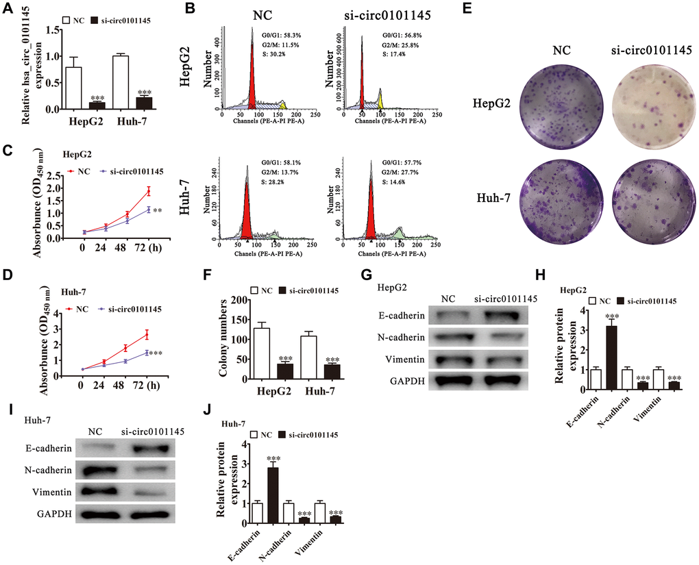 RT-qPCR revealed that hsa_circ_0101145 expression was decreased in Huh-7 and HepG2 cells following transfection with siRNA against hsa_circ_0101145 (si-circ-0101145) compared with the negative control (NC) (Figure 2A). Cell cycle distribution analysis showed that the proportion of cells in S-phase was decreased significantly and that the G2/M-phase proportion was increased following depletion of hsa_circ_0101145 (Figure 2B), suggesting cell cycle arrest at G2/M. CCK-8 (Figure 2C and 2D) and colony formation (Figure 2E and 2F) assays demonstrated that hsa_circ_0101145 silencing decreased proliferation of both HepG2 and Huh-7 cells. Western blotting revealed that knockdown of hsa_circ_0101145 promoted epithelial marker E-cadherin expression, but decreased mesenchymal markers N-cadherin and vimentin expression (Figure 2G–2J), suggesting that depletion of hsa_circ_0101145 inhibited the EMT of HCC cells.